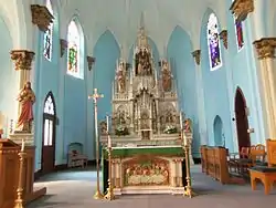 The current church building (1907) is built of red brick in the Gothic Revival style. The structure follows a basilica plan with what appears to be transept wings on the exterior, however, they are not true structural features.[4] The main facade is dominated by a tall central bell tower and spire. Each face of the tower has a clock in the gable at the top. Below the bell chamber surrounded by a round arch is a statue of the Blessed Virgin Mary. Two shorter towers capped with pinnacles are located on the corners. There are three entrances across the front with octafoil windows, and above the side entrances are paired round arch windows with small octafoil windows above them. Decorative brickwork is found in the upper portions of the exterior walls. The single nave interior is seven bays in length with a rounded seven-sided apse at the far end. The building contains period stained glass windows, its original wooden altars and a pipe organ. The side altars are located within pointed arch alcoves. Two murals that were painted in oil over the side altars and the Twelve Apostles on the intradoses of the nave arches were completed in 1937. The building was somewhat altered when the basement was remodeled into a parish hall to accommodate an entrance and a staircase between the hall and the main body of the church on the west side of the building. The changes were designed to blend with the original building.
