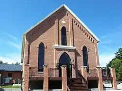 The original church (1877) is a simple version of the Gothic Revival style. It is a front-gable, brick structure that was built on a stone foundation. The side elevations are five bays in length. They are divided by flat brick pilasters, and each bay has a tall lancet window in the center. The main facade is symmetrical and three bays across its width. The main entrance is located within a slightly projecting pavilion. Beneath the eaves is a line of corbelling. At one time the main entrance and the upper portions of the lancet windows were closed while the lower portion of the windows were filled in with glass block.[4] A new entrance with a brick vestibule was created along the east side. A renovation in the early 21st century opened up the main entrance and the lancet windows, which were filled with tinted glass. A modern addition was added to the west side of the building to house religious education classes.