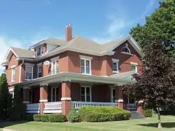 The rectory (1908) is constructed of the same brick as the church.[4] The two-story house is capped with a modest hipped roof, intersecting gables with partial cornice returns and a low hipped roof dormer on the west side. A one-story porch wraps around the southwest corner of the house. It features square brick piers, simple wooden spindle balustrade, and a shallow triangular pediment above the front steps. The house's window sills and lintels are concrete.