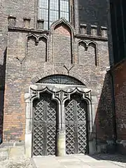 The church has seven portals, one in the west under the steeple, one in the eastern façade of the choir, two on the northern and three on the southern side, six of them (all except the western) are of sandstone masonry.
