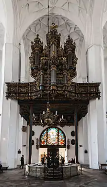 The inventories of St. Mary's reflect usage of Catholic-style accessories in Danzig's early Lutheran services. The inventory of 1552 still mentions a great stock of garments and embroideries.[4] The parishioners of St. Mary's formed a Lutheran congregation which - as part of Lutheran church polity - adopted a church order. A more elaborate church order (constitution) followed in 1612, the Alte kirchenordnung. The first senior pastor (Erster Pfarrer, pastor primarius) of Danzig's Lutheran state church was Johannes Kittelius, pastor at St. Mary's between 1566 and 1590.[1] The church officially was called Supreme Parish Church of St. Mary's (Oberpfarrkirche St. Marien), indicating its prominent position in the city.