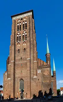 St. Mary's Church (Polish: Bazylika Mariacka, German: St. Marienkirche), or formally the Basilica of the Assumption of the Blessed Virgin Mary, is a Brick Gothic Roman Catholic church located in central Gdańsk, Poland. With its volume between 185,000 m3 and 190,000 m3 it is currently one of the two or three largest brick churches in the world. Only San Petronio Basilica in Bologna, comprising 258,000 m3 is larger, Munich Frauenkirche and Ulm Minster also comprise 185,000 to 190,000 m3.