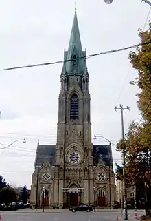 The first St. Mary's was a small white brick building erected by Bishop Armand-François-Marie de Charbonnel. However, due to problems with the foundation, this was taken down and a second church constructed on the foundations of the first. It was consecrated by Bishop John Joseph Lynch in May 1860. Eventually, structural problems developed with the second building and John Walsh, Bishop of the Diocese of London, Ontario and a former pastor of St. Mary's, engaged architect Joseph Connolly to design a new church.[1] The cornerstone was laid on 15 August 1881 and the dedication took place on 17 February 1889.[2]
