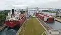 The Edgar B. Speer heading downstream and the Richelieu heading upstream in the Soo Locks