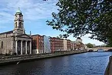 The church was designed by Patrick Byrne and built between 1835 and 1844, not long after Catholic emancipation. The front has a granite portico with four Ionic columns. The three-stage Italianate belltower, with its copper dome, was completed in 1843 and is a visual focal point along the quay, except where blocked by the dome of the Four Courts to the east. The inclusion of a clock, less common on Catholic Churches, implies a sense of public responsibility thus increasing the status of the building.[8]