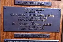 The crypt contains the remains of 20 congregants which are listed below.[29] Also indicated below are those that have been commemorated in the church through a plaque, a hatchment or a window.