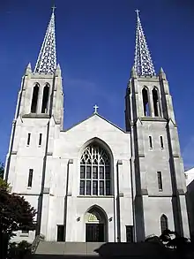 The cathedral was completed in 1962. The architectural style is Gothic revival. The two belfries with their tall spires can be seen from a distance.