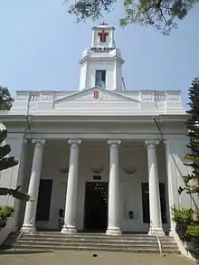 The church is considered an exact replica of St Clement Danes at London.[1] St. Thomas Garrison Church was modelled on contemporary churches like St. George's Cathedral, Chennai. It is located in the foothills of St. Thomas Mount and is named after St. Thomas, one of the Twelve apostles who resided at the place during his final years. It is 133 ft (41 m) long and 66 ft (20 m) wide. The compound was built with bricks, mortar and limestone. It is believed that the railings are made out of iron from the discarded weapons of Tipu Sultan. The Church was originally the starting point to Southern districts, located in 1, Grand South Trunk Road from Chennai. The building had a bomb-proof roof, rust-proof iron railings and cast iron chairs imported from England. The altar houses conventional Methodist images and a prayer hall for the worshippers. Paintings of Jesus Christ and other apostles are housed on the walls facing the worshippers. The room behind the sanctuary has a wooden staircase leading to the top of the tower. The original temple bell cast in England was heavy and developed cracks. It was replaced by a smaller bell from Rangoon donated by a church member. There are twenty windows, five doors, Roman ionic pillars, a false ceiling made of teak wood, imported chairs, Bible and a pipe organ. The British Army and administrative officers residing in the Garrison and regions around it made generous contributions to the church. The monument of Major-General William Sydenham is found in the precincts of the Church. The Church originally had a multi level tall spire, which was trimmed to accommodate passing flights from the nearby airport.[2]
