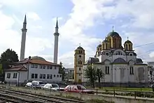 - ^ The official name of the church is "Church of the Holy Emperor Uroš"[7][8] (црква Св. Цара Уроша,[9] црква Светог Цара Уроша[10]). It is also known in Serbian as the Saborni hram svetog cara Uroša (Саборни храм светог цара Уроша),[11] which could be translated into "Cathedral/Temple of the holy emperor Uroš". Other names include "Church of the Holy King Uroš",[12] "Church of Holy King Uroš", "St. Uroš Cathedral", "Church of St. Uroš", etc. The church building is sometimes referred to as a "cathedral" because of its size although it is not a cathedral in the technical ecclesiastical sense, as it is not the seat of a bishop. In Serbian it is called hram (temple), which is another name for a church in Eastern Orthodoxy.