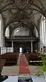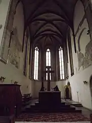 The chancel has two bays of cross vault and a spokewise vaulting at the ending. The ribs, which have a pear-like profile, are placed on pentagonal dosserets ending on the same level as the window cornice.