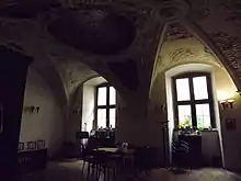The Baroque sacristy was built in 17th century. It is square shaped, it has two window axis and a low barrel vault. The vault is covered with rich stuke decorations of leaves and heads of angels.