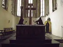 A large Statue of the Crucifixion stands in the presbytery. It was carved in 1930 by Czech artist František Bílek (1872-1941), who also made the altar table. It is made from larch wood.