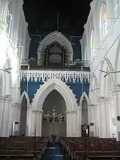 Three stained glass windows located at the apse are dedicated to three figures in Singapore's early colonial history and who are represented on the windows by their coats of arms. The window at the centre is dedicated to Sir Stamford Raffles, the windows on the left to John Crawfurd, the first major Resident of Singapore, and the windows on the right to Major General William Butterworth, the governor who initiated the construction of the second church building.[18] However, the original stained glass windows were damaged during the Second World War.[7][19] MacPherson is remembered in the grey and red granite memorial monument surmounted by a Maltese cross in the grounds, and by the stained glass window over the west door. Jalan Klapa was also renamed MacPherson Road in his honour. The gallery at the West end was not part of MacPherson's plan but added after the Cathedral opened. It has the only decorated elements in the church, with foliated pillars and pilasters, and crocketed arches.[7]