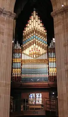St Andrew's Cathedral is of historic significance as the place of the first cathedral to be commenced in Australia. It reflects the changing views and attitudes both theological and social within the Diocese of Sydney in the physical changes that have taken place to the building. The collection of furniture, fixtures, artefacts and memorials record the history of the building, the history of the Anglican church in Sydney and key personalities involved in both church and civic life who have been associated with the building, the link between the building and the wider church with relics and items from other churches throughout the world and a tradition in quality of craftsmanship and design which can be seen from the 1860s to the present day. Its place in the development of architectural design and thought in the colony, as a perfect example of the colonial desire to reproduce England in Australia in the mid-nineteenth century which affected the design of many churches to follow in the colony. It is an example of the connection and inter-relationship of Church and State in the Colonial and Victorian periods. The Hill Organ, 1866, the first of approximately 40 organs they provided to NSW and one of the last to be made by Hill before his death. The Kinloch organ, the second organ to be built in the Colony of New South Wales.[7][2]