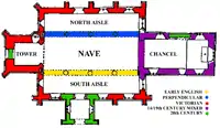 Internally the arcades are in different styles, the south arcade being Early English while the north arcade is Perpendicular.[3] The flooring is of 19th-century tiles. The font also dates from the 19th century and is in 15th-century style.