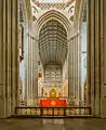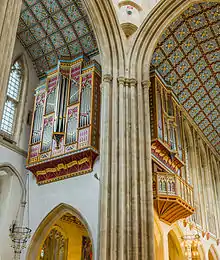 This church was largely rebuilt, starting in 1503, in the Perpendicular style by John Wastell, a master mason who also worked on King's College, Cambridge.[4] Further alterations to the building were undertaken in the 18th and 19th centuries, notably a new chancel and a hammerbeam roof by George Gilbert Scott.[5] When the Diocese of St Edmundsbury and Ipswich was created in 1914, St James's Church was made the cathedral. In 1959 Benjamin Britten wrote the Fanfare for St Edmundsbury for a "Pageant of Magna Carta" held in the cathedral grounds.[6]