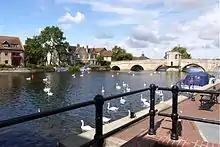The river Great Ouse at St Ives flooded in 1947, and some parts suffered seriously again at Easter 1998[7] and in January 2003.[8] Extensive flood protection works were carried out on both sides of the river in 2006-07 at a cost of nearly £9 million. 500 metres (1,600 ft) of brick-clad steel-piling was put into place to protect the town, most noticeably at the Waits, where a plaza has also been created. A further 750 metres (2,460 ft) on the other side of the river protects Hemingford Grey, reducing the yearly risk of flooding from 10% to 1%.[9] Building on the flood plain at St Ives is now discouraged.