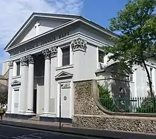 William Hallett, the architect, is not known to have been responsible for any other buildings in Brighton or elsewhere,[4] and he based the design of St John the Baptist's very closely on that of St Mary Moorfields in London, completed in 1820.[7] In particular, the southern frontage – which faces Bristol Road – is almost identical to that of St Mary's. The church is Classical in style, with a stuccoed exterior and a large pediment above the entrance.[4] The shallow roof is made of slate. The entrance porch is flanked by two columns with accompanying pilasters, and there are two more pilasters at the corner of the building. Blind doorways between the two sets of pilasters have small pediments and two deep-set windows above them. Below the main pediment and dentil cornice is a Latin inscription: DEO SUB INVOC. S. JOANNIS BAPT. ("To God, under the invocation of St. John the Baptist.") There is a side entrance in the western face, again with a pediment above it.[4][7]