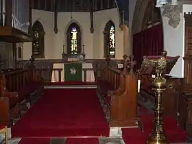 The entrance porch beneath the tower contains a replica of the Alnmouth Cross, the cross was found on Church Hill in the 1780s and has been dated to the 9th or 10th centuries. The cross’ lay out and style link it clearly with Lindisfarne Priory. The original cross is now in the Museum of Antiquities at Newcastle upon Tyne. The pulpit is a memorial to those killed in World War I and is carved with the soldier saints: Saint Oswald, Saint Maurice, Saint Martin and Saint George. The best examples of stained glass windows are in the apse, these being good representations of the early work of Charles Eamer Kempe, the rest of the windows are almost all modern, portraying saintly monks and were designed by C. Evetts. The sanctuary ceiling is significant because of its shape and decoration, it has the church organ on its left hand side.[2][5]