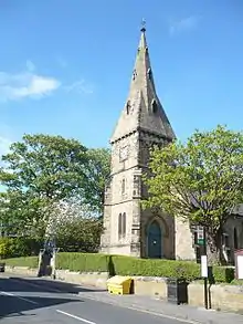 The church is constructed from snecked tooled stone with tooled ashlar quoins and dressings and consists of chancel, nave, north aisle, north and south porches, and an embattled western tower with spire. The tower is constructed with three stages, the first stage consists of a double doored main entrance with west facing double window, the second stage has lancet windows while the third stage has slatted belfry openings and clock. The stone spire on top of the tower tapers from square to octagonal and contains small gabled lucarnes.[4]