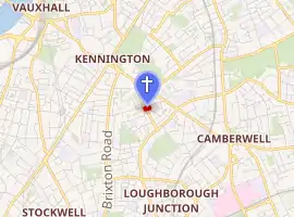 The church stands on Vassall Road, Kennington, in Vassall Ward in the London Borough of Lambeth. It is near Oval tube station and the Oval Cricket Ground. The spire can be seen clearly for miles around.