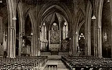 The original church interior was designed by George Frederick Bodley (Founder of Watts & Co. ), and was fitted out in a highly ornate style typical of the Victorian era and of Anglo-Catholic churches, including stone carvings by Thomas Earp, wrought iron altar rails, stained glass windows, and a carved reredos painted by Clayton and Bell. A new organ by J. W. Walker & Sons Ltd was installed in 1875.