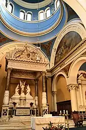 The high altar has a canopy (or baldachino), made from Sicilian marble. The surrounds and dome of the tabernacle are a copy of the original wooden surrounds from 1861. The mosaic pavement in the sanctuary is made from rock from the bed of the River Severn.