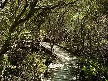 St Kilda is adjacent to the mangrove forest bordering Barker Inlet, part of the largest tidal estuary of Gulf St Vincent. Late in the 19th Century embankments were constructed through the mangroves in an effort to reclaim land for pasturing. With the construction of the banks of the adjacent saltfields, maintenance of the embankments ceased and the mangroves began to reclaim them. One of these embankments is used as the beginning of a boardwalk through the mangroves which forms a 1.7 kilometres (1.1 mi) loop[35] through the samphire saltmarsh flats and mangroves reaching the border between the ocean and forest.