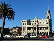 St Kilda was named by Charles La Trobe, then superintendent of the Port Phillip District, after a schooner, Lady of St Kilda, which moored at the main beach for much of 1841.[2] Later in the Victorian era, St Kilda became a favoured suburb of Melbourne's elite, and many palatial mansions and grand terraces were constructed along its hills and waterfront. After the turn of the century, the St Kilda foreshore became Melbourne's favoured playground, with electric tram lines linking the suburbs to the seaside amusement rides, ballrooms, cinemas and cafes, and crowds flocked to St Kilda Beach. Many of the mansions and grand terraces became guest houses, and gardens were filled in with apartment buildings, making St Kilda the most densely populated suburb in Melbourne.
