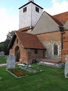 The small tower, which is 6 ft 6 in (1.98 m) square, has a timber-framed and shingled upper part, with a broach spire, which was restored in the 20th century.[1] Unusually, it is positioned at the west end of the south aisle. The lower stage is early-13th-century but the upper stage is modern. The presence of Tudor brick buttresses outside suggest that the upper portion became unsafe and was taken down.[10]