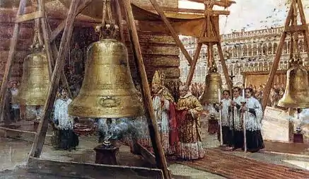 To announce the death of the doge and for the funeral, the bells rang in unison (9 series, each series slowly over 12 minutes). For the death of the pope, the bells rang for three days after Third Hour (6 series, each series slowly over 12 minutes).[93] The bells also marked the passing of cardinals and foreign ambassadors who had died in Venice, the dogaressa and sons of the doge, the patriarch and the canons of St Mark's, the procurators of Saint Mark, and the Grand Chancellor (the highest ranking civil servant).[94]