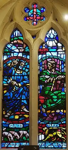 The church contains stained glass (1957) depicting St Peter and St Mark by Brian Thomas
