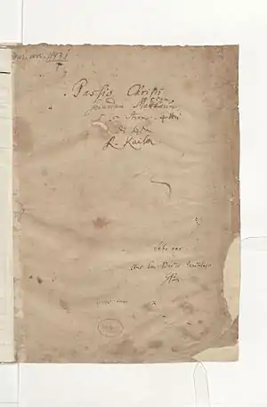 The passion was probably composed around 1705 by Gottfried Keiser,[1] by his son Reinhard,[2] or by Friedrich Nicolaus Bruhns.[3][4] The 18th-century scores of the composition don't always indicate a composer, but the name of Reinhard Keiser or "Kaiser" is found there.[1] The work can also be considered as an anonymous composition.[5] The music of this passion is known from Bach's three versions, from an anonymous manuscript score that originated in or around Hamburg, and from another anonymous manuscript score that is conserved in the county of Hohenstein, Thuringia. No libretto author for the original work is known. Also for the later arrangements text authors are largely unknown, except for the pasticcio parts by Handel based on the Brockes Passion by Barthold Heinrich Brockes.