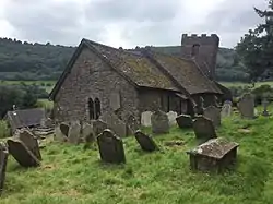 The church is constructed of Old Red Sandstone rubble with stone-tiled roofs.[1] The architectural style is Gothic and the building comprises a nave, chancel, porch and a three-storeyed tower with a castellated parapet.[1] The interior is slightly less altered than the exterior, the nave roof dating from the late 13th or early 14th centuries.[3] The unevenness of the structure remains very evident, however; the writer Simon Jenkins noting, "visitors might be on the deck of a galleon in a storm, with the chancel about to slide overboard".[7] The Monmouthshire writer and artist Fred Hando describes the church chancel as an example of a "weeping chancel", where the non-alignment of the nave and chancel axes was deliberate and was intended to represent the body of Christ in death, the nave standing for the body and the chancel standing for the head, fallen to the right.[8] The rood screen is a "remarkable work of craftsmanship".[7] The church's windows are 16th century and the communion rails date to the 17th century.[3] A number of 18th and 19th century funeral monuments within the church were constructed by three generations of the Brute family of the distant village of Llanbedr, near Crickhowell, Powys.[3]