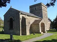 The Norman structure has a three bay nave with a south porch and chancel. The short two-stage tower is central and has a quadripartite vault below it.[3] The door in the porch is round headed and has columns on either side. The outside of the building has five Romanesque corbels including one with double human heads which may be from a later period. The 12th century font consists of a cylindrical stem on rectangular blocks. The bowl is square and decorated on three faces.[4][2]