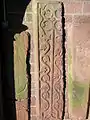In a niche at the east end of the aisle are two carved Viking hogback stones. These are very rare pre-Norman tomb markers that were found under the foundations of a 12th-century wall of the church during restoration in 1896–97. The early 11th century is the latest possible date.[4] The hogbacks are each in the shape of a house. The larger tomb has on its sides humans astride smaller serpents battling with larger serpents. The smaller stone has two armies thought to be concluding a truce.