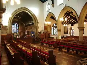 Inside the church, the arcades are carried on alternate round and octagonal piers. There is an ancient font dated 1667, which stands near to the pulpit and inscribed "T. R. 1667". It is believed to have been given by Thomas Robinson, vicar from 1653 to 1654. It may not have originally been a font at all, however, but instead a plague stone for disinfecting money or a vessel for the clergy to wash their hands following Holy Communion. It is square with chamfered corners, and stands on a square pillar. There is also a later font, of Caen stone, given by churchwarden Mr Norris of Howick House in 1865.