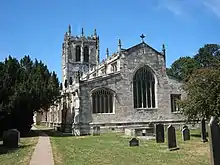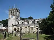 The church is of a perpendicular style and built out of local magnesian limestone with Welsh slate roof. The church has a three-stage west tower, a three-stage bay aisled nave, south porch and a two-bay aisled chancel.[2] It has been described as possessing "a fine show of buttresses, pinnacles and gargoyles."[3] As mentioned in the section above, it contains fragments of a Norman church incorporated at various points.