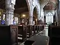The interior features pointed arches on columns and extensive carved woodwork, including the 1877 pews, a 1912 pulpit and a 1915 screen in the St Nicholas chapel.[2][3][1] The black and white flooring is marble, from 1903.[1] The East Window above the altar is stained glass by Morris & Co.. Most of the design is by Edward Burne-Jones, but some panels are by William Morris himself.[1] The organ dates from 1833 by Elliot and Hill, but having been rebuilt three times.[1]