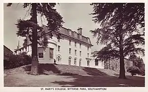 In 1922 it became the first Secondary School for Catholic boys in Southampton, under the name of St Mary’s College, and opened with five Brothers and 30 pupils.[1] During the Second World War rapid expansion of the school took place; the number of pupils passing from 200 at the start of the War to 400 at the end. In 1992 the junior department started taking girls and in 2000 the senior department was opened to girls, and latterly approximately 25% of the pupils were girls. The schools mission is to 'seek to foster the growth of the whole person within a Mennaisian community'. Former pupils are known as Old Simmarians.[2]
