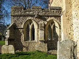 The oldest parts of the church, dating from about 1300, are the Tower, the Porch and the lower parts of the walls of the aisles. In 1350 the South aisle walls were rebuilt to their present height and new windows were inserted.[1]