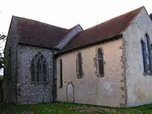 St Mary the Virgin Church is a simple two-cell structure built during three periods. Its nave is 11th-century; a chancel was added early in the 13th century; and transepts were built on the north and south sides later in that century.[8][12][19] The north transept was buttressed and built with a more square shape in anticipation of a tower being built on top,[6] but this did not happen and a small belfry surmounts it instead.[5] The church is built of locally quarried flint and stone.[7]