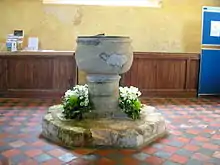 The oldest fixture is a "tub-like"[11] stone font with a lead bowl, dating from between 1200 and 1250 and standing at the west end of the church. The wide bowl is supported on a thin pillar and has little decoration.[7][9][11] Its shape is reminiscent of a chalice, and it was carved from sandstone quarried at nearby Pulborough.[18]