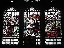 The tower has rounded-headed windows in its middle stage and tall, much narrower rounded lancets in the upper stage.[4][8] The lancet windows in the chancel, inserted in the 13th century, underwent 19th-century restoration[4] and have stained glass by Charles Eamer Kempe.[15] The nave also has lancets, put in during the 1835 rebuilding,[4] and several windows in the aisles were installed as memorials during the Victorian era.[9] The east window is contemporary, and its stained glass may be by the Clayton and Bell firm.[15] Ken Adams of the Cox & Barnard firm of Hove designed a memorial window for the north aisle in about 1950, showing the Presentation of Jesus at the Temple.[16]