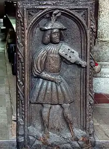 The screen is one of the finest 15th century examples in Cornwall; it has three gates and the cornice of vines and tracery and vaulting are finely carved.[5] The 79 bench-end carvings were executed by Robert Daye between 1510 and 1530 (Pevsner attributes them to 1524 or later) and portray a range of subjects including a Cornish piper and fiddler (Daye's name is given on one but the date is illegible). Also, one of the damaged pew ends was repaired to its former glory by the late local master joiner Douglas Edwards in the 1980s.[6] Langdon (1896) records seven stone crosses in the parish, of which one is in the churchyard.