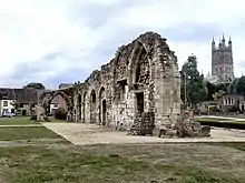 However, the priory soon declined into obscurity. Late in the reign of King Cnut its estates were used as an endowment for a royal clerk. In 1089 Serlo, the Norman abbot of the original St Peter's, began an ambitious new church (later Gloucester Cathedral) to replace the old minster, and St Oswald's, its emoluments much reduced, became a minor house of Augustinian canons.[6] The monastery was suppressed in 1536, and became the parish church of St Catherine, but this was destroyed in a Civil War siege in 1643.[2]