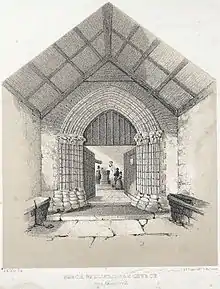 The Normans arrived in Ceredigion in 1073–1074,[61] and from the early twelfth century Norman political and ecclesiastical influence gradually increased, aided by the appointment, after 1115, of Norman bishops of St David's.[62] In about the year 1106, Ithel and Madoc, who were in alliance with King Henry I, ravaged all the county of Cardigan, as Ceredigion was called by the Normans, with the exception of Llanbadarn Fawr and Llanddewi Brefi. Nevertheless, Llanbadarn Fawr suffered an attack upon its sanctuary, from which several of Owain ab Madoc's men, who had taken refuge there, were dragged out by force and put to death. But by this time, scarcely a generation after Rhygyfarch was writing his Life of St David, the clas had declined in its spiritual and pastoral life, and its political importance, although its financial position remained strong, due to the substantial revenues of its extensive lands.[63]