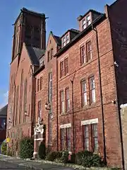St Patrick's Church is served from St Edmund's Church on St Edmund Street in Bolton. St Edmund's Church was also founded from Ss Peter and Paul Church.[3] In August 1860, the foundation stone of St Edmund's Church was laid by the Bishop of Salford, William Turner on Grime Street (which was later renamed St Edmund Street). It was finished in 1861. Originally, it had the school situated on the lower storey of the church. In the early twentieth century, the school was relocated and the lower storey became the parish hall. In the 1960s, the hall was extended and the church was reordered.[5]