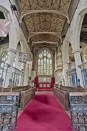 Internally, the tower is 13 feet (4.0 m) square.[1] It has a vice (spiral staircase) in the south-east corner that is accessed through an external door.[1] The nave measures 70 feet (21 m) by 20 feet 6 inches (6.25 m).[1] It has a clerestory and arcades with arches over slender piers.[2] There are two arches between the nave and the chancel.[1]