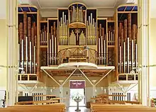 Work on the new church began at Easter 1990 and was completed in 1991. It retained the grand Georgian portico but beyond that the interior is described by visitors as clean, bright and modern.[10] The choir and organ are at the west end, as in the 1827 plan, but the fittings are thoroughly modern. The church is accessible and has disabled-accessible toilets. Behind the altar is an apse that is decorated entirely with gold mosaic. Around the side of the apse, part of the 1873 sanctuary which survived the fire can be seen, and also a side chapel now used as the vestry office, complete with stained glass.